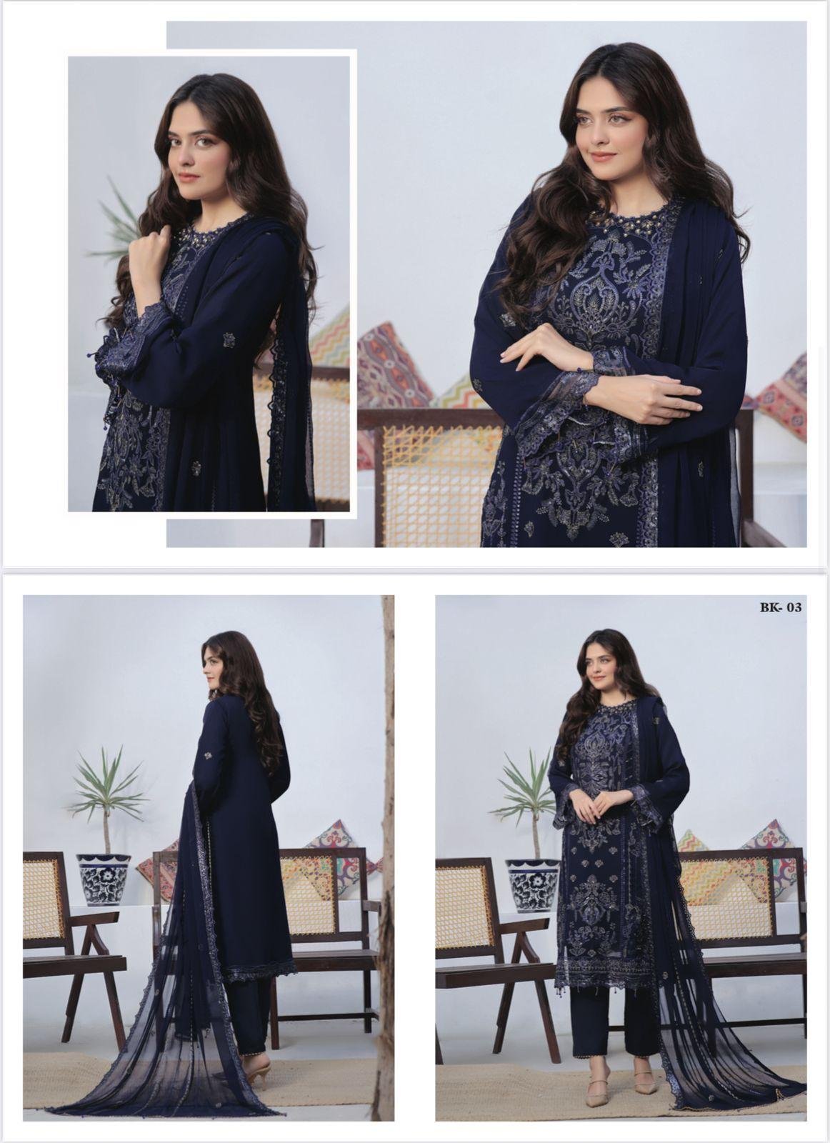 This elegant Pakistani dress features a beautifully designed kameez paired with a matching shalwar and dupatta. Crafted with premium fabric and delicate detailing, it offers both comfort and style—perfect for festive occasions or graceful everyday wear.